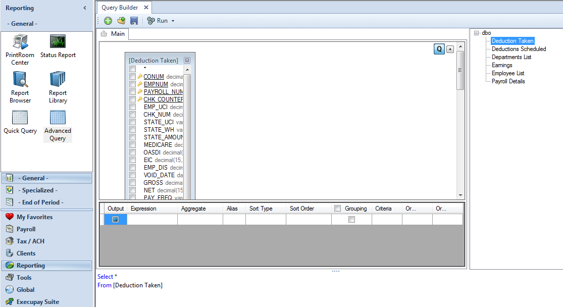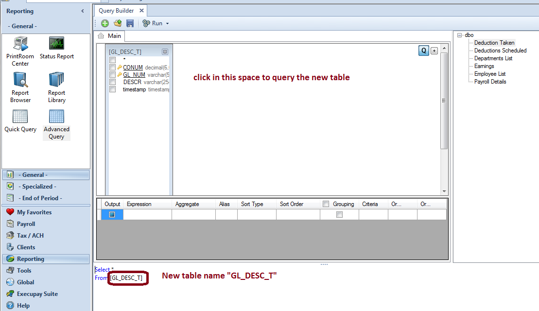 1) Open Advanced Query (Reporting > General). Select one of the available tables on the right.